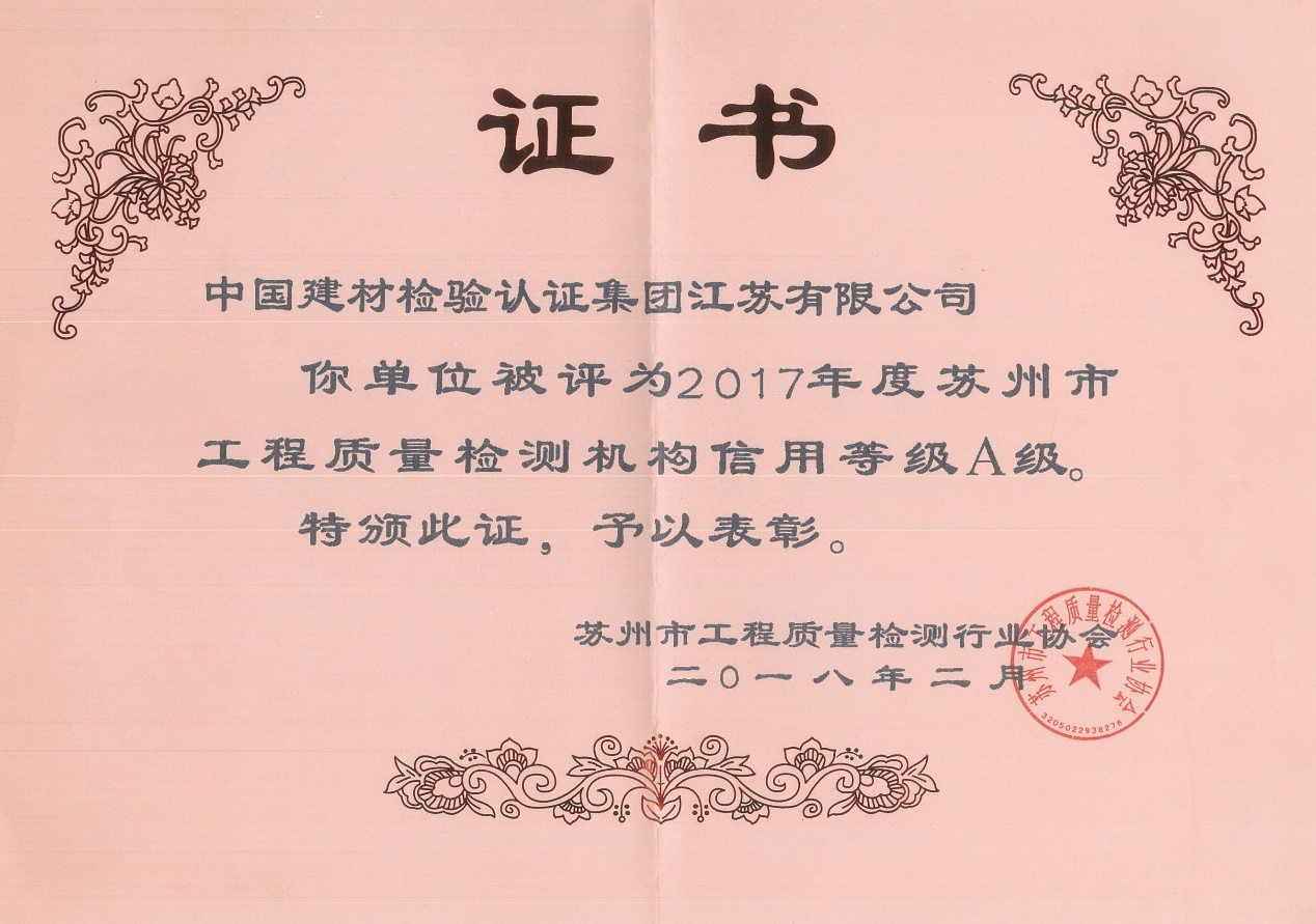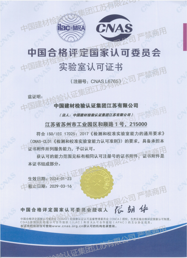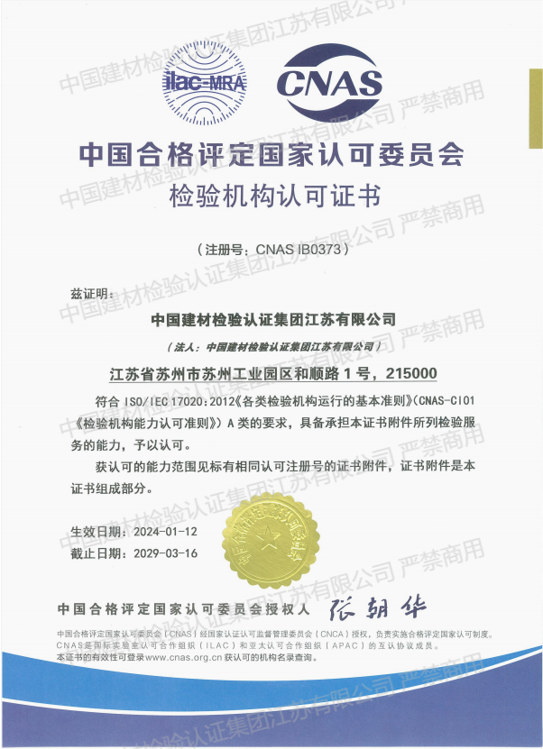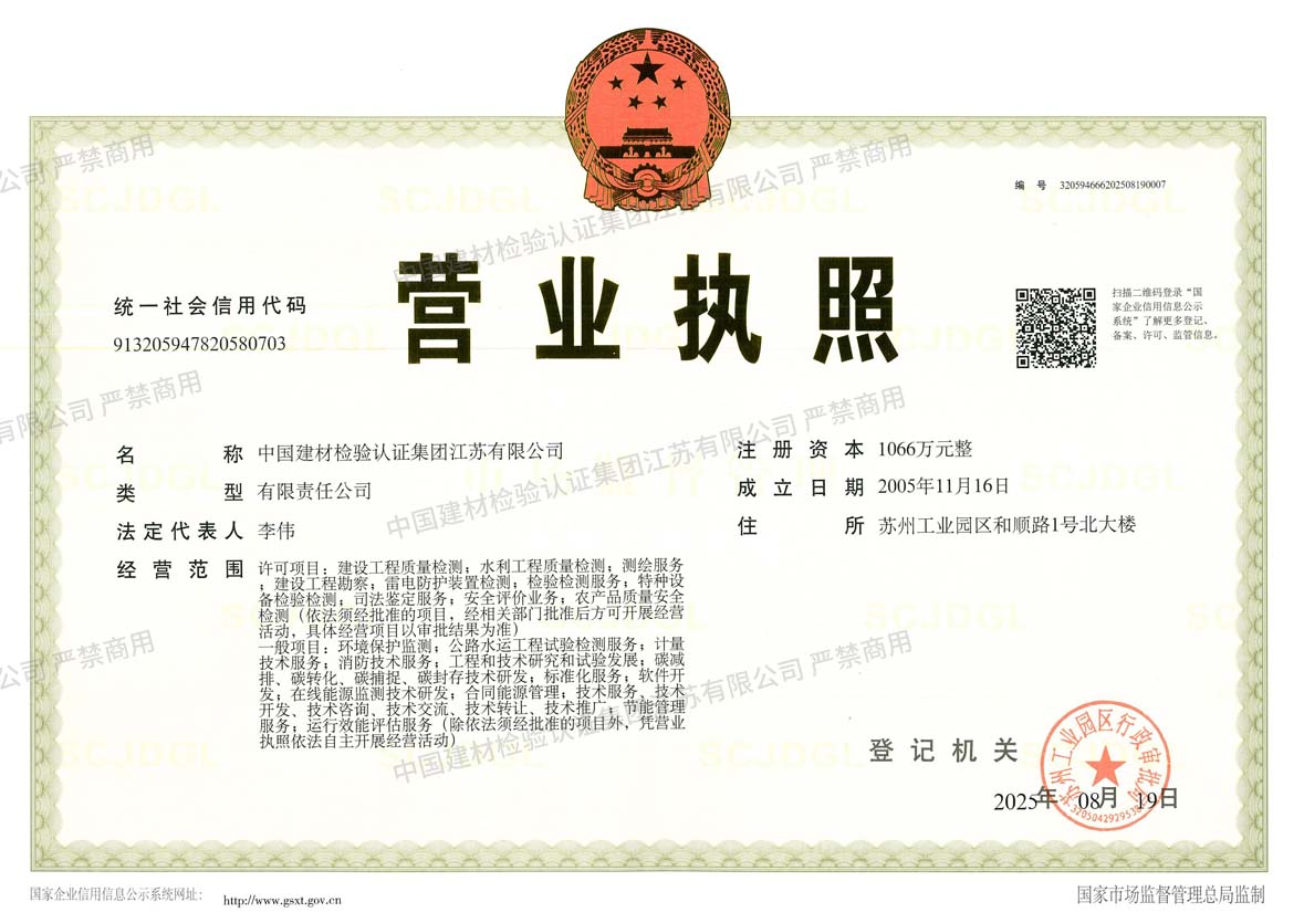 中國(guó)建材檢驗(yàn)認(rèn)證集團(tuán)江蘇有限公司,隸屬于國(guó)檢集團(tuán),總部位于蘇州工業(yè)園區(qū)和順路1號(hào),于2005年11月16日成立,試驗(yàn)室面積約11000平方。